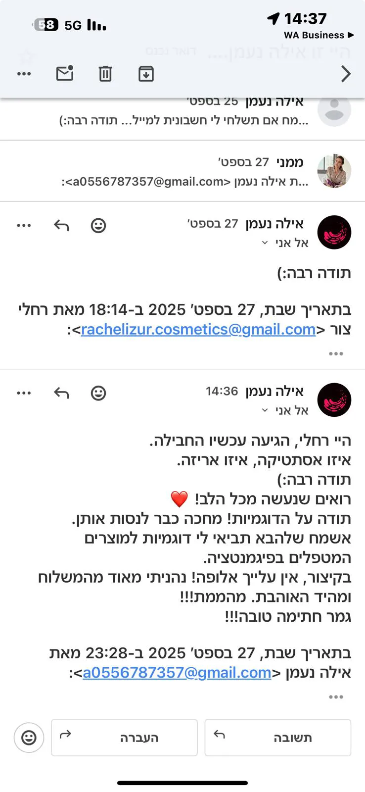 רחלי היא קוסמטיקאית שלי מעל 7 שנים כול מיכשור הכי חדיש אצלה , מקצועית כול חצי שנה. אני אצלה בטיפול פנים מוצרים שאני רוכשת , מעבר לזה שהיא אישיות מיוחדת בעלת לב ענק מלאה בסבלנות רבה ❤️ תודה עלייך 🫶